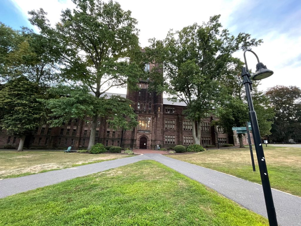 大学の建物を紹介したいと思います。アメリカの北東の方では赤いれいがの建物が多いです。マウントホリヨーク大学のまん中では、赤いれいがの建物が多くて、とてもきれいだと思います。