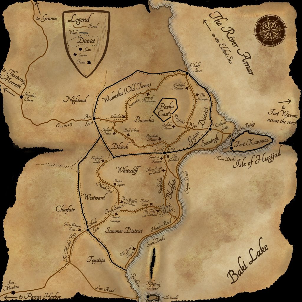 The capital of Bakianna sits on the shoreline of Baki Lake and oversees trade along the coast from the river access there. Since the death of Zendon Danren the 13th, this city has been both the heart of the revolution and of the nobility. Such an intersection has caused the city to become a scene of daily confrontation and anger; a virtual tinderbox from which the events that will shape this nation are sure to begin.