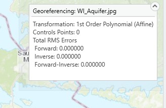 Tools on the Georeference tab are divided into several groups, in order left to right, to help you use the correct tools in the different phases of your georeferencing session. Once you click on the Georeference tab, the top right corner of the Map View, will show the “WI_Aquifer” that will be georeferenced and the RMS, which is empty (Errors), because the georeferencing process hasn’t started yet.
