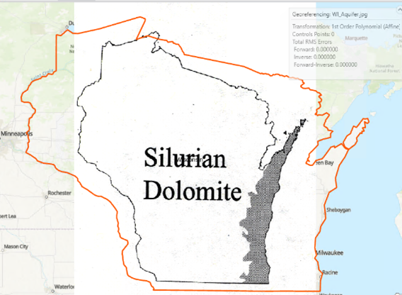 Scenario: You are an ecologist and found on the internet an image representing Silurian aquifer in east Wisconsin. The image has a false coordinate system (arbitrary numbers assigned when scanned), and the rest of your digital data are registered to a geographic coordinate (Latitude – Longitude). To georeference the scanned image, you will use a vector layer of Wisconsin.