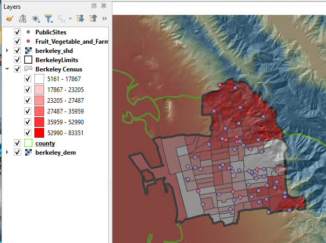 In our imagined scenario, the City of Berkeley, CA has assigned you the task of identifying lower income communities with limited access to fresh fruits and vegetables. The City would like to identify five civic buildings that are in close proximity to these neighborhoods and place weekly produce stands on their property. Therefore, your final product will be a map depicting the location of these potential sites and their service areas.
