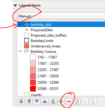 - Right under “Legend Items” click the down arrow and choose “Manual”. This activates some buttons below the layers