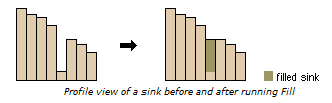 Sinks represent depressions (real or erroneous) in your data that impede water flow and therefore must be removed. The software fills the sinks by raising their elevations to equal neighboring cells so that water can continue to flow across them.
