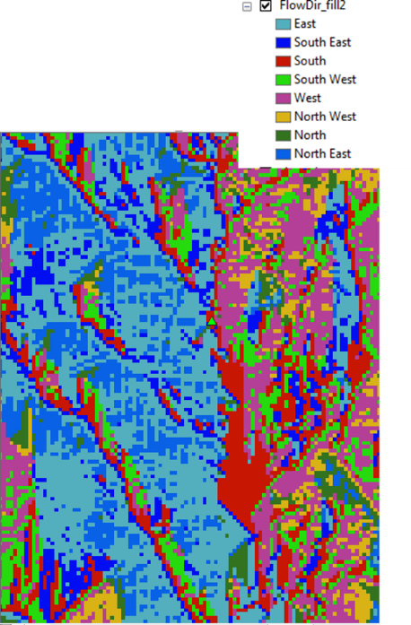 The legend will have numbers in from 1 to 128 according to the figure on the right. Cells with values of 1 are cells flowing to the East, south flowing cells have a value of 4, 16 to the west, and 64 to the north. You could change the legend values using the symbology pane to make better sense of the image. See figure below fora suggested legend.