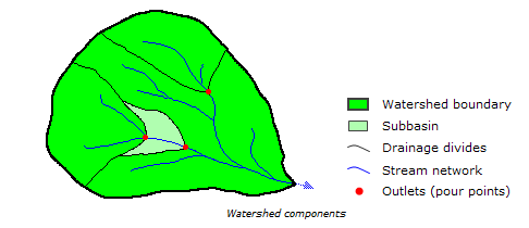 A watershed or drainage basin describes the area of land from which all surface waters (rain, melting snow or ice) converge at a single point. This point is the exit of the watershed and usually forms a stream or lake. Watersheds are important hydrologic and environmental units because all water within one watershed is connected. Thus, water pollution at one point in the watershed will affect the entire area downstream of that point and thus becomes an important issue in environmental restoration and protection. Since water always flows from the highest point to the lowest, watershed boundaries (drainage divides) are defined as the ridges separating flow.