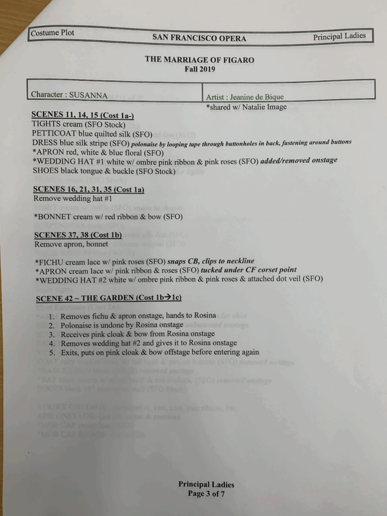 “Susanna has a wedding bonnet that needs to be quickly attached and removed […] in Act I and Act IV. If she were wearing the bonnet for real use, it would be affixed with several hat pins. But there is no chance to do that in the time she has on stage, so our Susanna […] has magnets built into her wig, with corresponding magnets on the hats! She also has two hats – one for Act I when it needs to be thrown around, and one for Act IV that has the lace veil for the night-time disguise.”