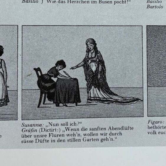- “It is striking that there were no uniform ostumes, and that the sets for The Marriage of Figaro were also used in other works. For example, Brioschi’s set design for Act II, the Countess’s boudoir, at the Vienna Court Opera, was also used in Le Postillon de Lonjumeau by Adolphe Adam, while his “French garden,” first seen at the Vienna Court Opera in 1866, also appeared in Lucia Lammermoor by Gaetano Donizetti.” Mozart’s Operas, page 140-141. ↩︎