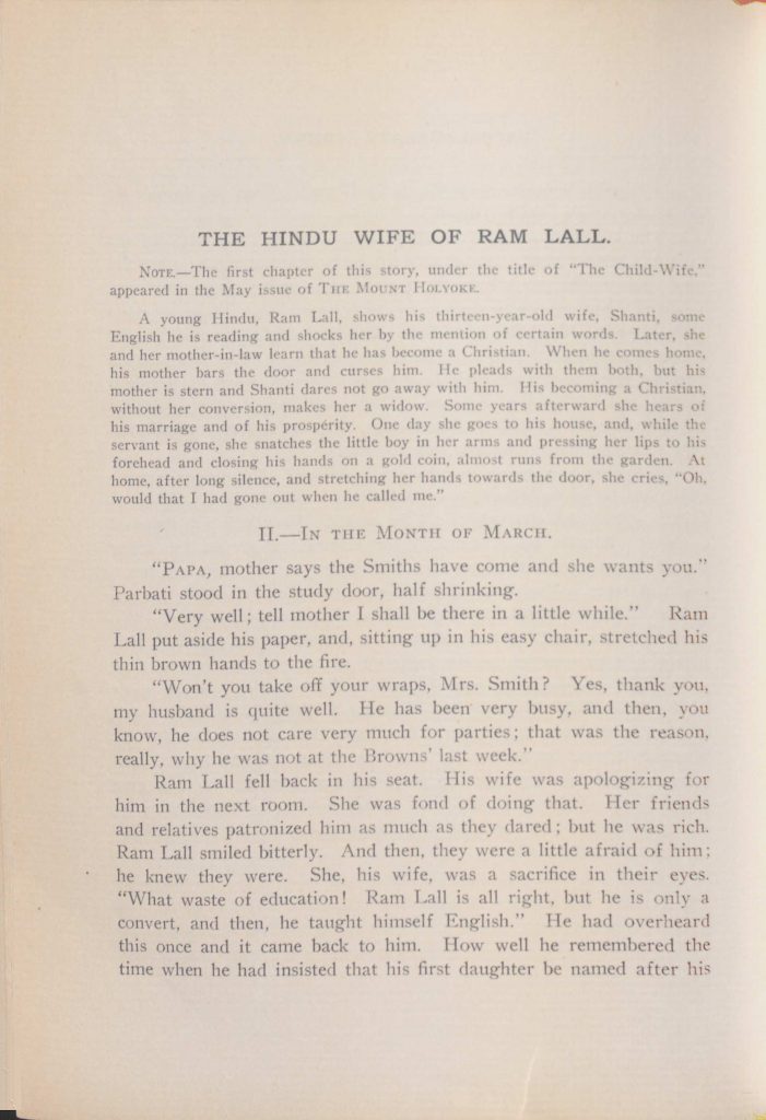 The Hindu Wife of Ram Lall, an English play written by Dora Mohinie Maya Das, class of 1909, in which she played Ram Lall’s mother in 1908. The Mount Holyoke, Issue 18, 1908-09. Click on the image to read the entire play.
