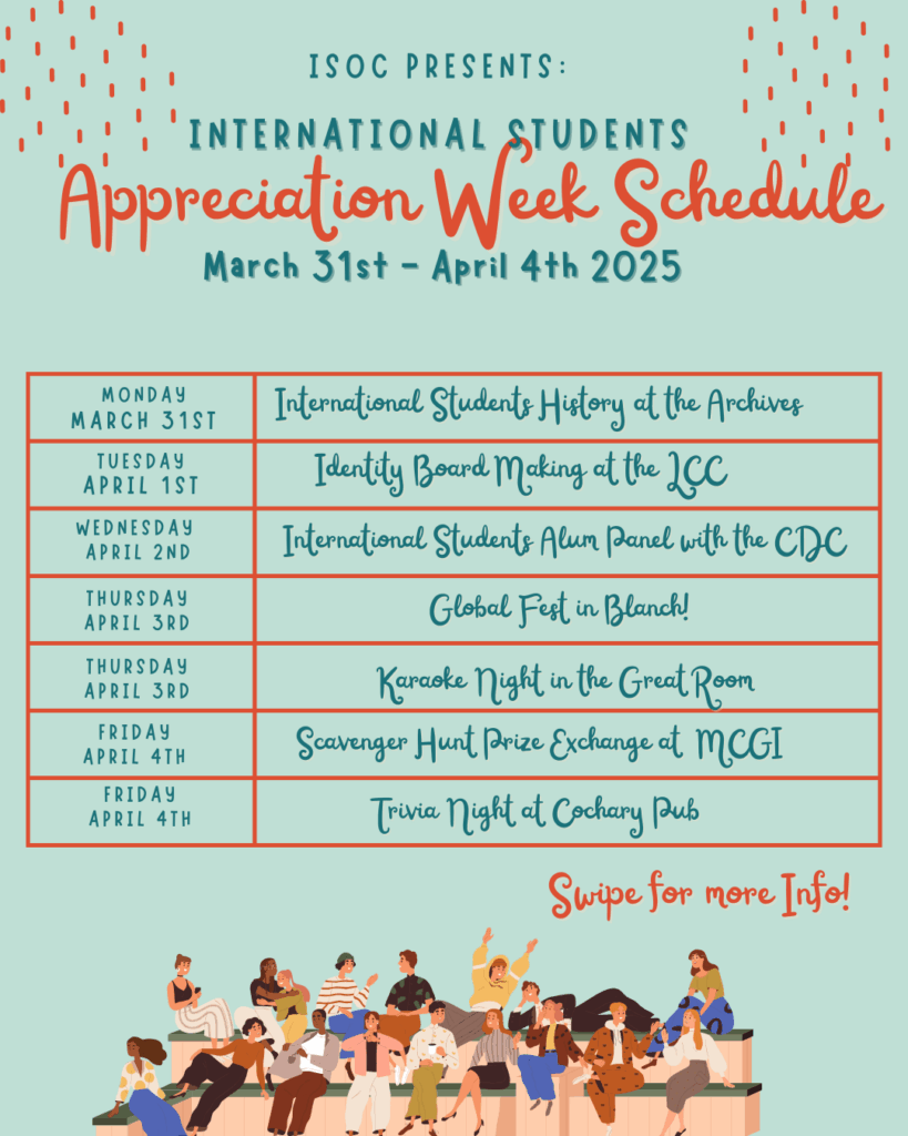 Pictured above is the ISOC Board at Global Fest, spring 2025. Left to right: Ria Miller (Jamaica), class of 2026; Hana Cho (South Korea), class of 2027; Nathania Amadi (Nigeria), class of 2026; Yewon Lee (South Korea), class of 2026; Sky Cho (South Korea); class of 2025; Annette Darpoh (Ghana), class of 2028; and Anju Ito (Japan), class of 2028.