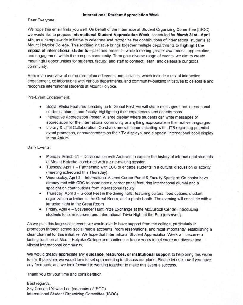 Above is the initial “Pivot” email sent to campus leadership to initiate and organize International Student Appreciation Week, marking the beginning of collaborative planning efforts across departments, spring 2025.