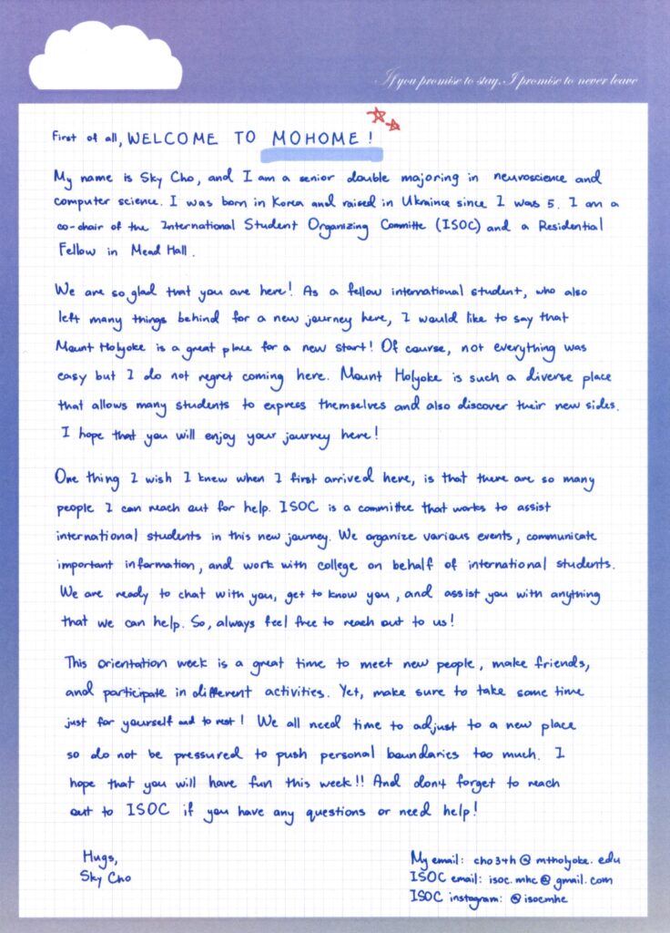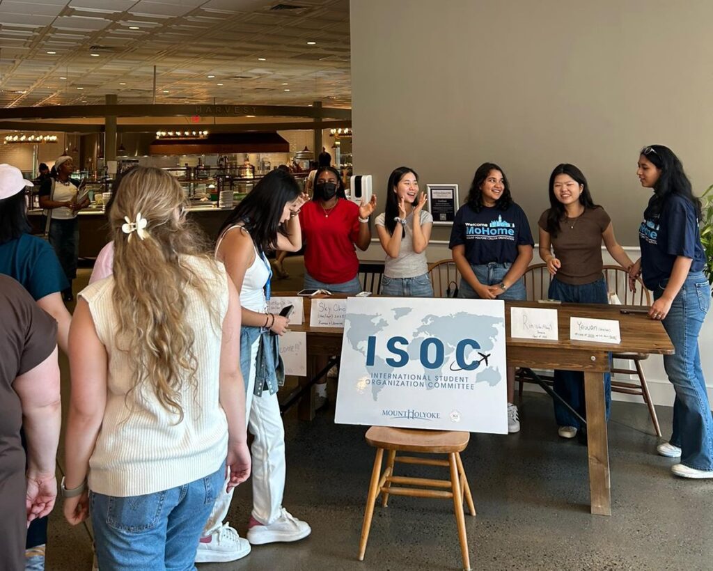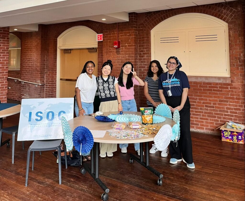 Pictured above International Students at the “Get to Know ISOC” information table in the Blanchard Great Room, fall 2024. Left to right: Nathania Amadi (Nigeria), class of 2026; Yewon Lee (South Korea), class of 2026; Sky Cho (South Korea) class of 2025; Ria Miller (Jamaica), class of 2026; and Manal