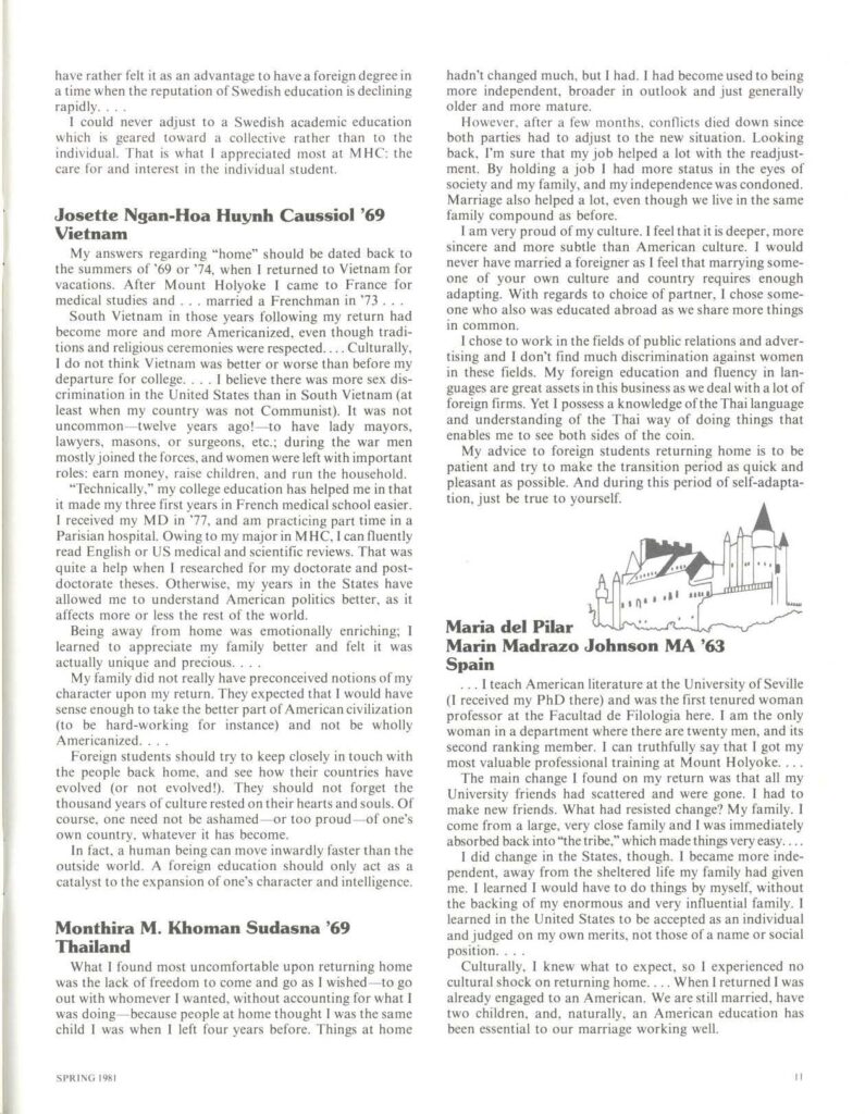 Above is a letter by Josette Ngan-Hoa Huynh, class of 1969, to Hwei-Ming Boey, class of 1980, in which Huynh writes about her adjustment after returning home from Mount Holyoke, January 1, 1981. Hwei-Ming Boey, class of 1982 and from Malaysia, initiated a project called “Home Once Again,” in which she wrote to alumnae who had been international students at Mount Holyoke, asking about the nature of their adjustment to Mount Holyoke and their adjustment after returning home. Huynh was among the 50 out of 354 alums who responded. The Spring 1981 Mount Holyoke Alumnae Quarterly published Boey’s project.
