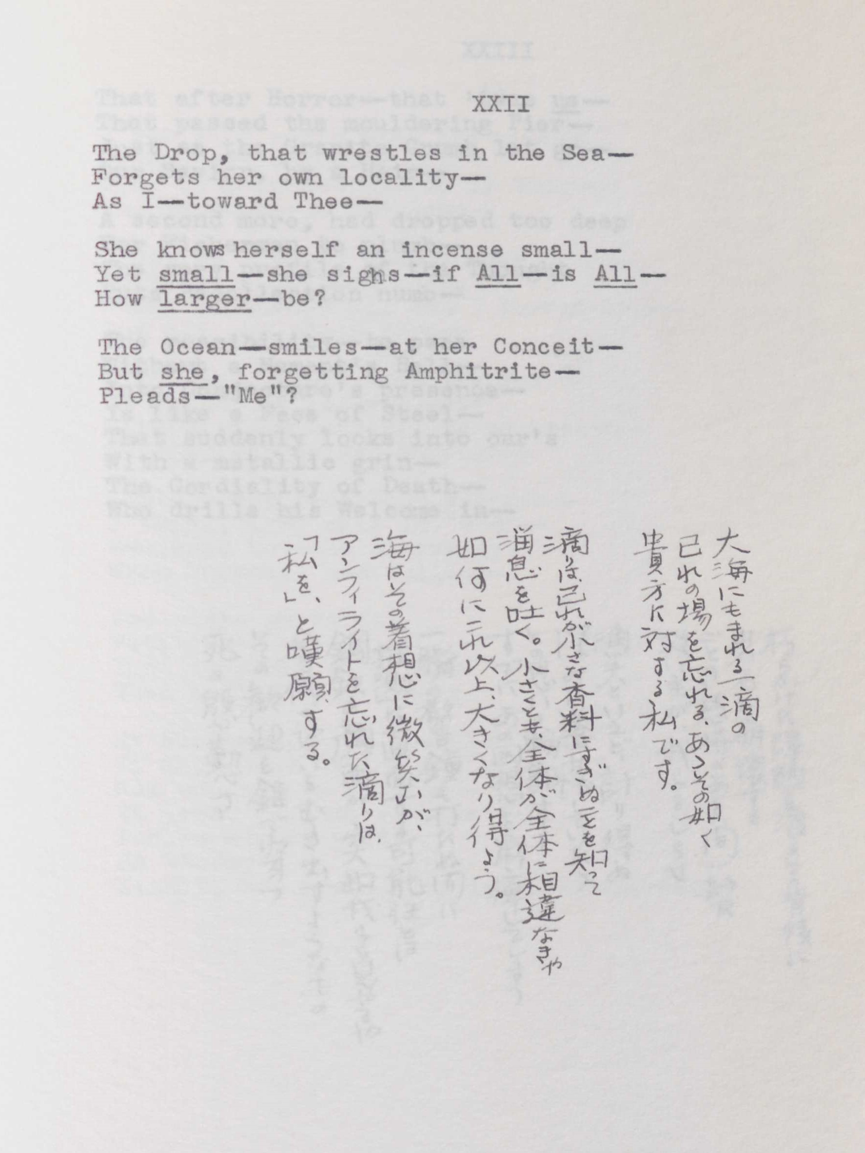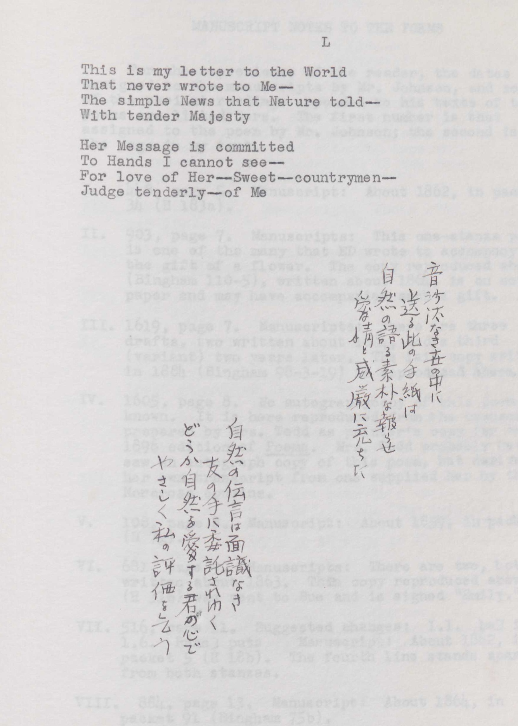 Pictured above are Japanese translations of Emily Dickinson by Yoshie Osada (Japan), MA class of 1958, as part of her thesis “The ‘Heft of… Tunes’: A Study of the Problems Involving in Translating Certain of Emily Dickinson’s Poems into Japanese.”
