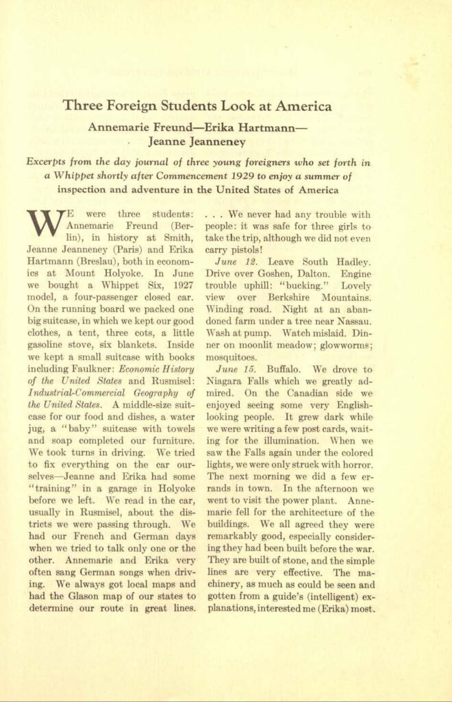 This journal of three international students shares their travels across the country in an automobile. The entries largely focus on exploring different state colleges and national parks. Their experiences include a lunch with Ruth Muskrat, class of 1925, an Indigenous alumna from Mount Holyoke, sleeping in a decommissioned syrup shed, and a meeting with one of Booker T. Washington’s sons. In an account of the trio’s attempts to purchase the car from a dealer, Freund inadvertently implies they may have stolen the vehicle by forging the notarization of a cash endorsement.