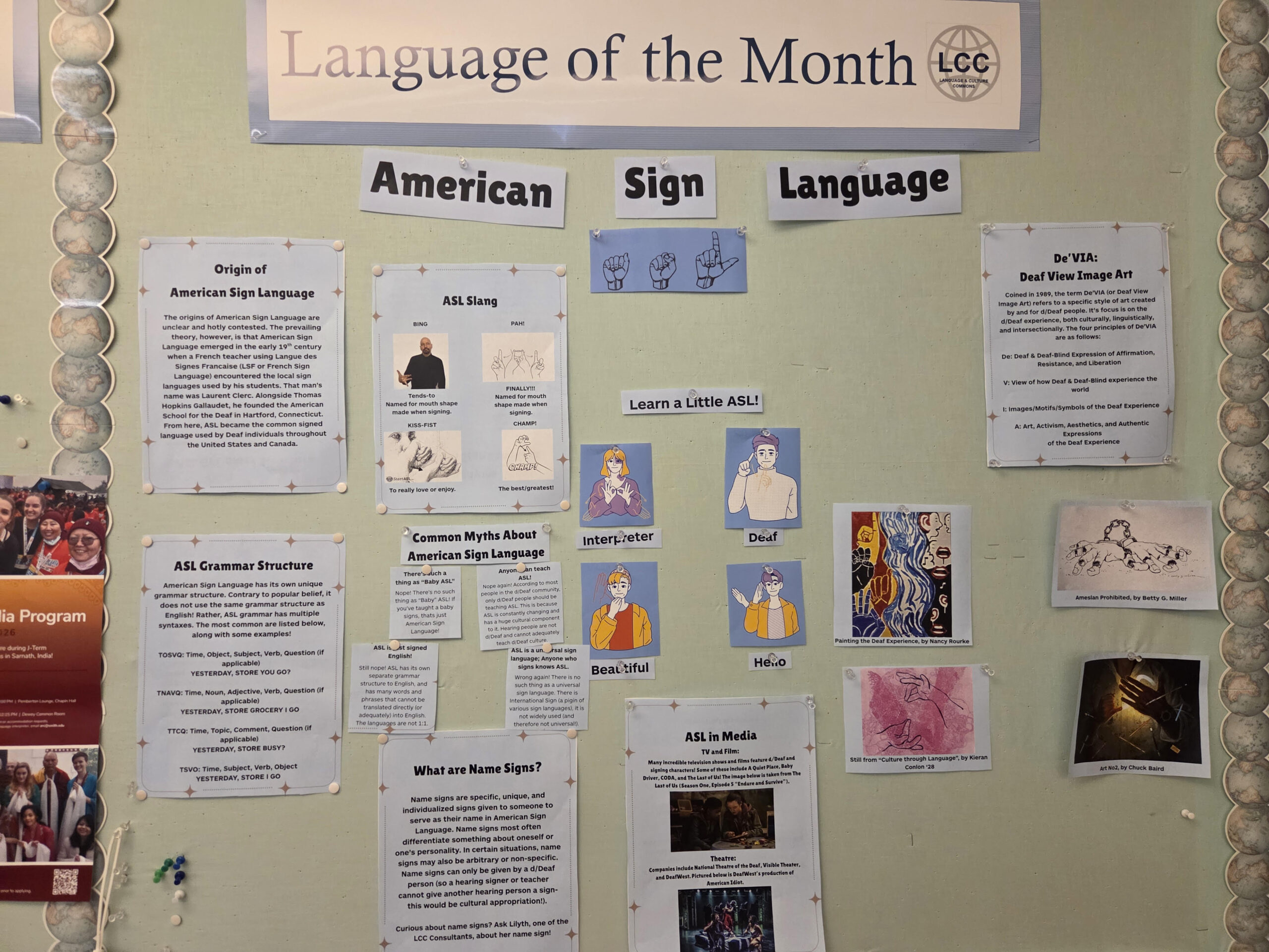 American Sign Language (or ASL) is a complete visual language. It is primarily used by d/Deaf and Hard of Hearing people throughout the United States and Canada. The origins of American Sign Language are unclear and hotly debated, but ASL most likely originated in the early 19th century when teachers using Langue des Signes Francaise (or French Sign Language) encountered students using local sign languages at the American School for the Deaf in Hartford, Connecticut. Today, ASL is the first language of approximately 500,000 people (although this number is tentative, as ASL has never been included as an option on the US Census). Check out our LOTM board in the LCC!