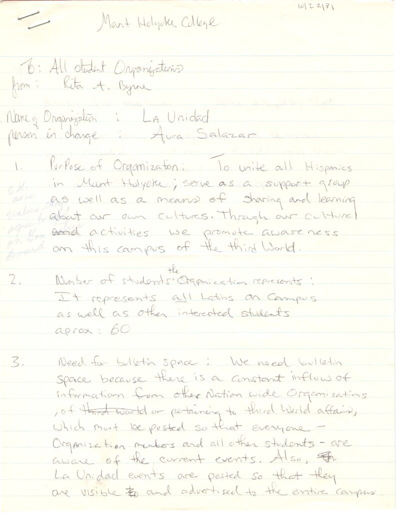 There’s a noticeable gap in archival records featuring Latina students at Mount Holyoke up until the founding of La Unidad. Starting in 1976, La Unidad served as a space for visibility and reunion, during which Latinas could partake in their culture, discuss issues on campus, and eventually act on those issues. The first portion of this exhibit traces the beginnings of Latina movements on campus up until 1995.