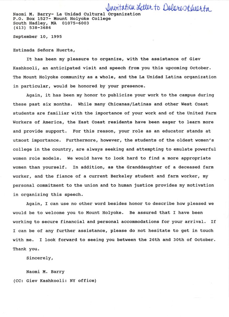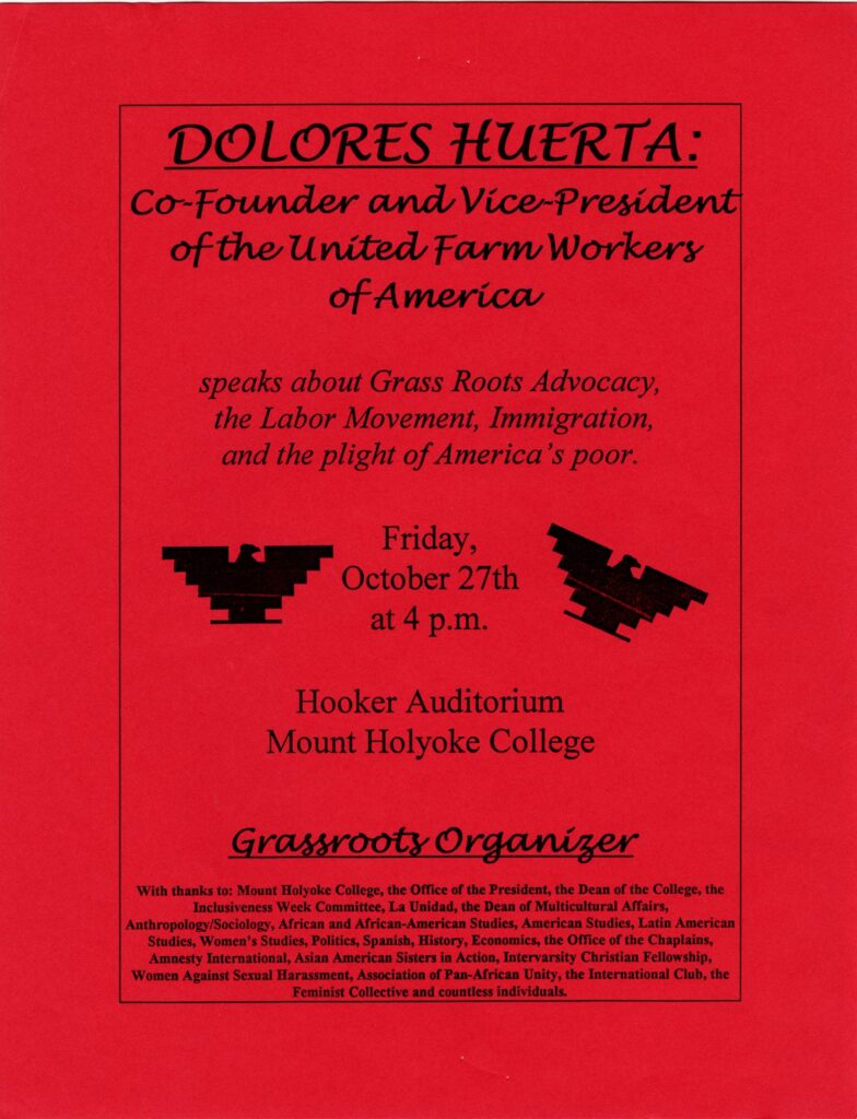 In 1995, La Unidad invited Dolores Huerta to speak at Mount Holyoke. Huerta is one of the leaders of the United Farm Workers and a grassroots activist.