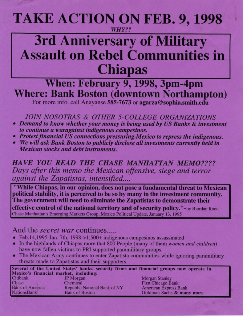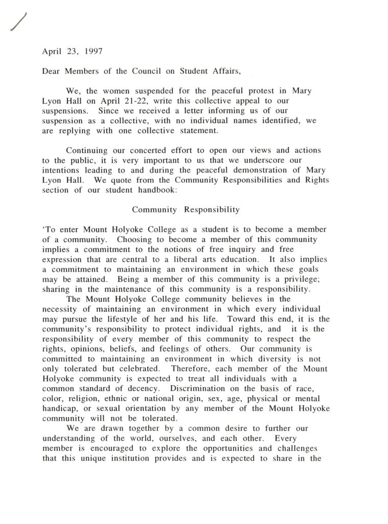 With the dawn of the new century, the College unveiled the Mount Holyoke Plan for 2003 in 1997. The plan proposed changes to academic programs and a possible removal of needs-blind admissions, spurring protests from numerous parties on campus, but especially from people of color. In April 1997, a class walkout, rally, and sit-in in Mary Lyon Hall took place, led by Fabiola Tafolla, class of 1997. The students who participated in the sit-in faced punishment from the College, including mass suspensions. This is an open letter from suspended La Unidad students sent to the administration in protest.