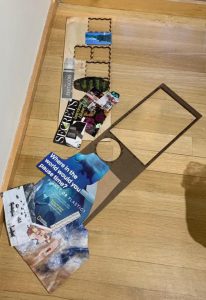 The installation was housed within the Blanchard Student Art Gallery. The front wall is mostly glass. If you were to walk up to the glass, this is what you would see. On the left, we collaged over the glass with newspapers. The newspapers had some cut-outs scattered throughout, to evoke the imagery of frames. Specific headlines and stories are highlighted through the cutouts on the newspaper. The cut out portions encourage viewers to look through them to attempt to see what is present on the other side of the glass. On the right side of the door, there are multiple pieces of colored construction paper, with a snippet (maybe a headline, maybe an image, maybe an infographic) from the newspapers on the left stuck to them. The singular snippets are emphasized further by the fact that they are the only thing that take up space on the construction paper. The viewer is automatically drawn only to that single snippet, mimicking the reverse effect of a newspaper. The bottom of the glass had a reflective wrapping paper-like material.
